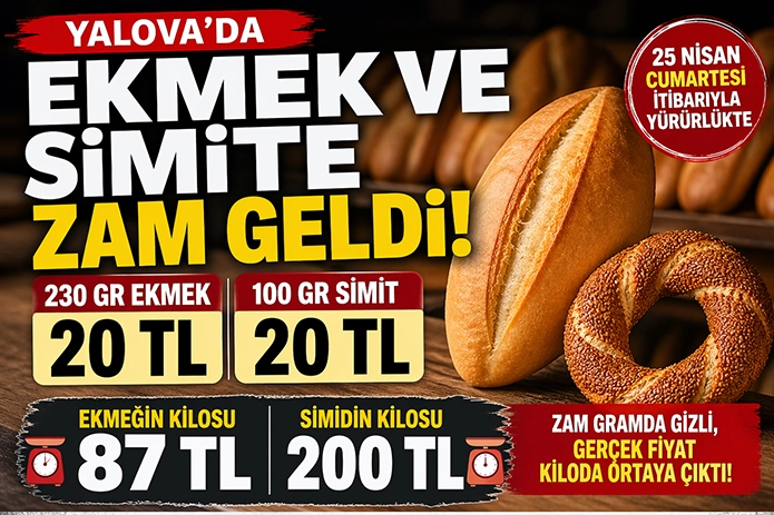 Zam gramda gizli: Ekmeğin kilosu 87 TL, simidin kilosu 200 TL’ye çıktı.Yalova’da uzun süredir beklenen fiyat düzenlemesi resmen yürürlüğe girdi. Yalova Esnaf ve Sanatkarlar Odaları Birliği (YESOB) tarafından hazırlanan yeni tarife, Yalova Valiliği onayının ardından 25 Nisan Cumartesi itibarıyla uygulanmaya başlandı.