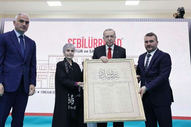 Cumhurbaşkanı Erdoğan, en büyük mirasın bu mücadele ruhu, medeniyet şuuru ve arayış bilinci olduğuna inandığını ifade eden Erdoğan'a konuşması sonrasında 17 Şubat 1921'de İstiklal Marşı'nın yayımlandığı ilk Sebilürreşad nüshası hediye edildi.