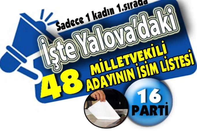 Bu 16 partiden katılacak olan milletvekili aday sayısı ise 48. Yalova milletvekili adaylarının 28 tanesi üniversite mezunu,23 tanesi ortaokul mezunu, 1 tanesi ise ilkokul mezunu.