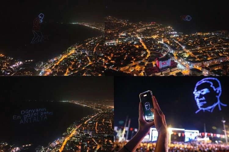 Konserin ardından Cumhuriyet Meydanı semalarında 500 drone ile muhteşem bir koreografi sunuldu. Drone gösterisini Başkan Muhittin Böcek, Antalya Valisi Hulusi Şahin, CHP İl Başkanı Nail Kamacı, CHP Antalya Milletvekilleri Cavit Arı, Mustafa Erdem ve AESOB Başkanı Adlıhan Dere ile birlikte izledi. Gökyüzünde dronların oluşturduğu Cumhuriyet’in 100. Yılı, Atatürk, Türk bayrağı görselleriyle görsel şölen yaşandı. Meydanı dolduran on binler gösteriyi hayranlıkla ve alkışlarla izledi. Gecenin sonunda kentin altı noktasında aynı anda gerçekleştirilen muhteşem bir havai fişek gösterisiyle Cumhuriyet coşkusu zirveye çıktı.