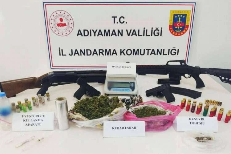 Yapılan aramalarda 2 adet ruhsatsız tabanca, 12 adet tabanca mermisi, 3 adet av tüfeği, 31 adet av tüfeği fişeği, 466 gram kubar esrar, 1 adet hassas terazi, 4 adet uyuşturucu kullanma aparatı, 30 gram kenevir tohumu ele geçirildi.