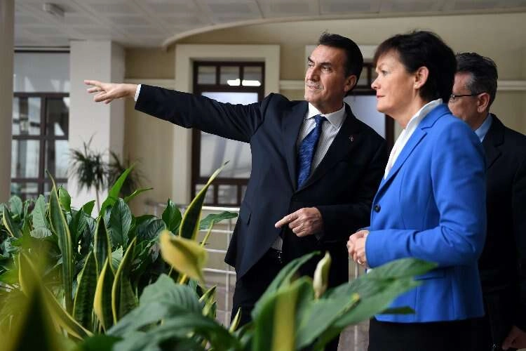 Bursa’da olmaktan büyük memnuniyet duyduğunu ifade eden Almanya Hessen Eyaleti Bakanı Lucia Puttrıch, “Biz Bursa’yla Hessen Eyaleti arasındaki ilişkilerin geliştiğini görüyoruz. Şahsi buluşmalar ve bir araya gelmeler çok önemli sayın Başkan Hessen Günleri Festivaline katıldı. Bizde iadeyi ziyaret gerçekleştirdik. Benden sonra benim yerime göreve gelecek olan meslektaşımı motive etmek için bu ziyareti gerçekleştirdim. Yıllar önce Almanya ve Türkiye arasında bir köprü kuruldu. Bunun bir alt kademesi de Bursa ve Hessen Eyaleti arasında kurularak bu köprüyle bu ilişkiler daha da sağlamlaştırıldı. Bu köprünün üzerinden her defasında geçmemiz gerekiyor. Biz Başkan Dündar’la bu köprünün sapasağlam ayakta kalmasına katkı yaptık. Bir yerde sallantı varsa bunun tekrar sağlamlaştırılması için elimizden geleni yaptık. Ben bana göstermiş olduğu nazik karşılama ve sözlerinden dolayı Başkan Dündar’a teşekkür ediyorum. İnsanların bizleri görmesi gerekiyor, özellikle zor zamanlardan geçiyorsanız, ortak çalışmayı ve birlikteliği gerektirdiği zamandan geçiyorsanız bu çok önemli, gülen bir yüzle ortaklık çok önemli biz Osmangazi Belediyesi’nden bir heyeti karşıladığımız da çok sevinçliydik. Bir araya gelmek insanların bizleri görmesi birlik ve beraberliğin tesis edildiğini görmeleri ve ikna olmaları son derece önemli, bu görüşmeler dijital olarak olmaz buraya geldiğimizde insanlar bizleri siz geldiğiniz sizleri görecek. O sebeple bu birliktelik çok çok önemli ve simgesel yönü de var” dedi.
