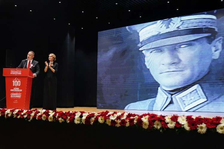 Konuşmasında Cumhuriyet’in kuruluş hikâyesini büyük bir gururla anlatan Beylikdüzü Belediye Başkanı Mehmet Murat Çalık, “Gazi Mustafa Kemal Atatürk ve silah arkadaşları bir asırlık çınarımız Türkiye Cumhuriyeti’nin hikâyesini, yani bizim hikayemizi yazmıştır. Bu memleket büyük acılarla, büyük emellerle, muazzam çabalarla kurulmuştur. Biz istiyoruz ki bizden sonraki nesiller de bu değerleri çok sevsin. Gazi Mustafa Kemal Atatürk bize ortak bir gelecek kurma imkânı verdi ve o geleceğin içindeyiz bugün. Tam 100 yıl önce bölünmüşlük ve parçalanmışlığın bizi nasıl felaketlere sürüklediğini tarih bize öğretti. O yüzden diyoruz ki 100.yılında Yaşasın Cumhuriyet.Tarih sayfalarına yazılan kocaman bir hikâyedirCumhuriyet. Bu hikâyenin devamında bir milletin mutluluğu, çocuklarının kahkahası, gençlerinin yüksek hayalleri var. Bizler, Mustafa Kemal’in askerleri var oldukça bu hikâyeyi bitirmeye kimsenin gücü yetmez. Yapılacak çok iş, yürünecek çok yolumuz var. Bu hikâyede omuz omuza olduğunuz için teşekkürler. Gururla, ilk günkü heyecanla, Cumhuriyet Bayramımız kutlu olsun” ifadelerini kullandı.