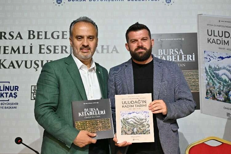 BURSA (İGFA) - Bursa’yı değerleriyle geleceğe taşıyan Büyükşehir Belediyesi, somut olmayan kültürel mirasa katkılarına yeni yayınlarla da devam ediyor. Kenti fiziki açıdan yenilerken aynı zamanda şehrin köklü kültürel birikimine de eserler sunan Büyükşehir Belediyesi tarafından kent belgeliğine kazandırılan “Uludağ’ın Kadim Tarihi” ve “Bursa Kitabeleri” adlı 2 yeni eserin tanıtımı, Atatürk Kongre ve Kültür Merkezi Müzeler Galeri Alanı’nda yapıldı.