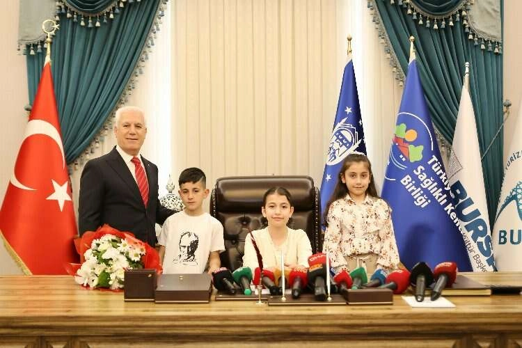 BURSA (İGFA) - 23 Nisan Ulusal Egemenlik ve Çocuk Bayramı’nda geleceğin ülke ve kent yöneticileri makamları sahiplerinden devraldı. Bursa Büyükşehir Belediye Başkanı Mustafa Bozbey de makamını Nurettin Gülten Kutlucan İlkokulu 4. Sınıf öğrencisi Zeyna Defne Kesmez’e devretti. Tarihi Belediye Binası’nda düzenlenen devir teslim törenine geleceğin başkanına okul müdürü Mehmet Salih Şahin, sınıf öğretmeni Ayşe Gül Yeşil, sınıf arkadaşları Şeymanur Öğüt ve Arda Adil Güler eşlik etti.