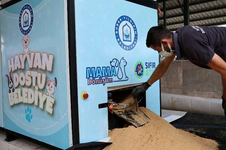 BURSA (İGFA)- Yıldırım Belediyesi Sıfır Atık ve İklim Değişikliği Müdürlüğü’nde kurulan Mama Üretim Tesisi ile haftalık toplanan 2 ton yemek atığı kedi ve köpeklerin yiyeceği hazır mamaya dönüşüyor.