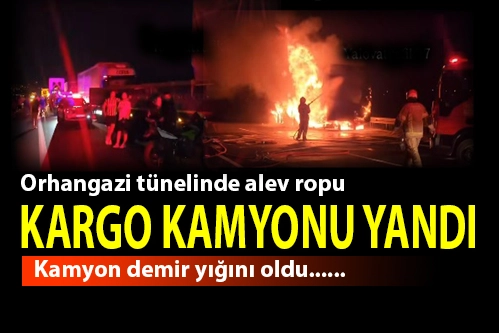 Şoför Ramazan Altıntop yönetimindeki bir kargo kamyonu, Orhangazi’de tünel çıkışında yandı. İstanbul-İzmir otobanı bir müddet trafiğe kapandı.Araçtaki yangını fark eden Altıntop aracını kenara çekti. Yangının çıkış nedeni belli olmöazken bölgeye gelen itfaiye kamyonu,2 saatte söndürdü.