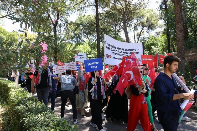 Fakültenin ana girişi önünde toplanan öğrencilere, akademik ve idari personelin yanı sıra sivil toplum örgütü temsilcileri de destek verdi. Yerleşke içinde ellerinde Türk ve Filistin bayrakları ile yürüyüş düzenleyen grup, Gazze'ye destek sloganları attı.