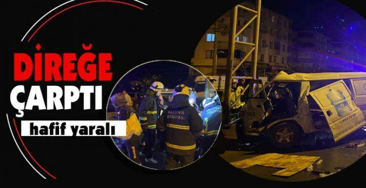 Çiftlikköy Devlet Hastanesi Kavşağında kontrolünü kaybeden su firması minibüsü trafik işaretleri direğine çarptı.Bilinmeyen nedenle kontrolünü kaybeden araç kullanıcısı kapı sıkışınca itfaiyenin kaza kurtarma ekibin gelmesini beklemek zorunda kaldı.