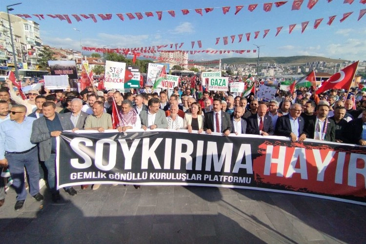Tarık ŞEKER / BURSA (İGFA) - Gemliklilerin büyük bir ilgi gösterdiği yürüyüş Engelsiz Kafe önünden başlayıp İstiklal Caddesi üzerinden 15 Temmuz Demokrasi Meydanı'na kadar sürdü. Yürüyüşte ellerinde Türk ve Filistin bayrağı ile İsrail’in zulmünü lanetleyen Gemlikliler‘Gemlik Filistin’in Yanında , “Soykırıma Hayır, Çocuklar Ölmesin, Soykırımcı İsrail, Bebek Katili İsrail, Ateşkes Hemen Şimdi, Filistin’e Özgürlük, Filistin İşgal Altında, Filistin İçin Sesini Yükselt’ gibi pankartlar tayşınırken ‘Kahrolsun israil, kahrolsun Amerika", "Katil israil Filistin'den defol" gibi sloganlar atıldı.