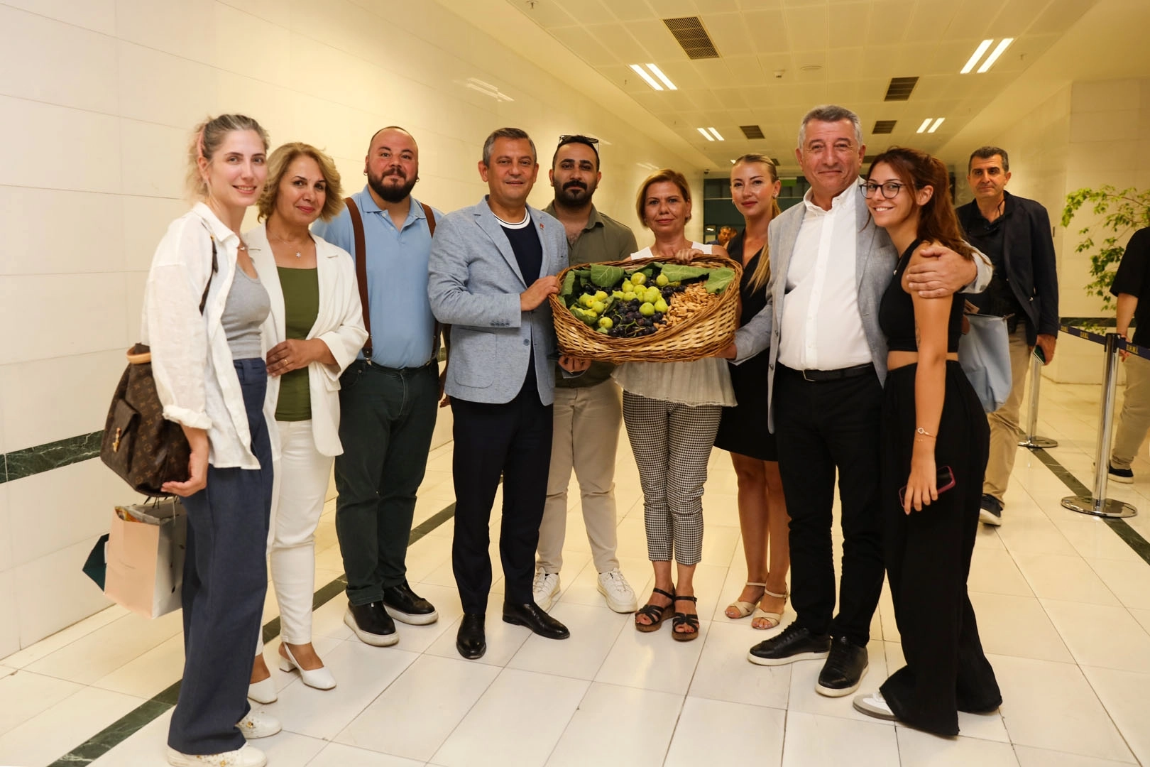 İZMİR (İGFA) - Cumhuriyet Halk Partisi (CHP) Genel Başkanı Özgür Özel’i akşam saatlerinde Manisa’da bir düğüne katılmak üzere, İzmir Adnan Menderes hava Limanı’nda karşılayan Güzelbahçe Belediye Başkanı Mustafa Günay, CHP Güzelbahçe İlçe Başkanı Devrim Seyrek, CHP Kadın Kolları Başkanı, Hülya Pilor, CHP Güzelbahçe Gençlik Kolları Başkanı Eren Kırca, CHP Güzelbahçe Gençlik Kolları önceki dönem Başkanı Şeyda Çiftçi, CHP Malatya İl Kdın Kolları Başkanı Nezahat Aydın karşıladı. Başkan Mustafa Günay, 10.’sunu düzenleyecekleri Payamlı Bardacık Festivali’ne bardacıklı bir sepet vererek Genel Başkanı davet etti.