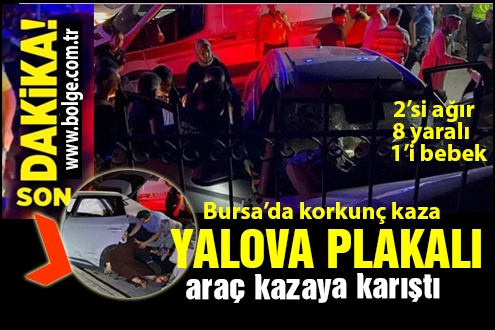Bursa’nın Yıldırım ilçesinde gece yarısı meydana gelen feci kazada aynı araçta bulunan 8 kişi yaralandı. Feci kazaya Yalovalı plakalı araçta karıştı.77 plakalı araç duvara çarparak durabildi.