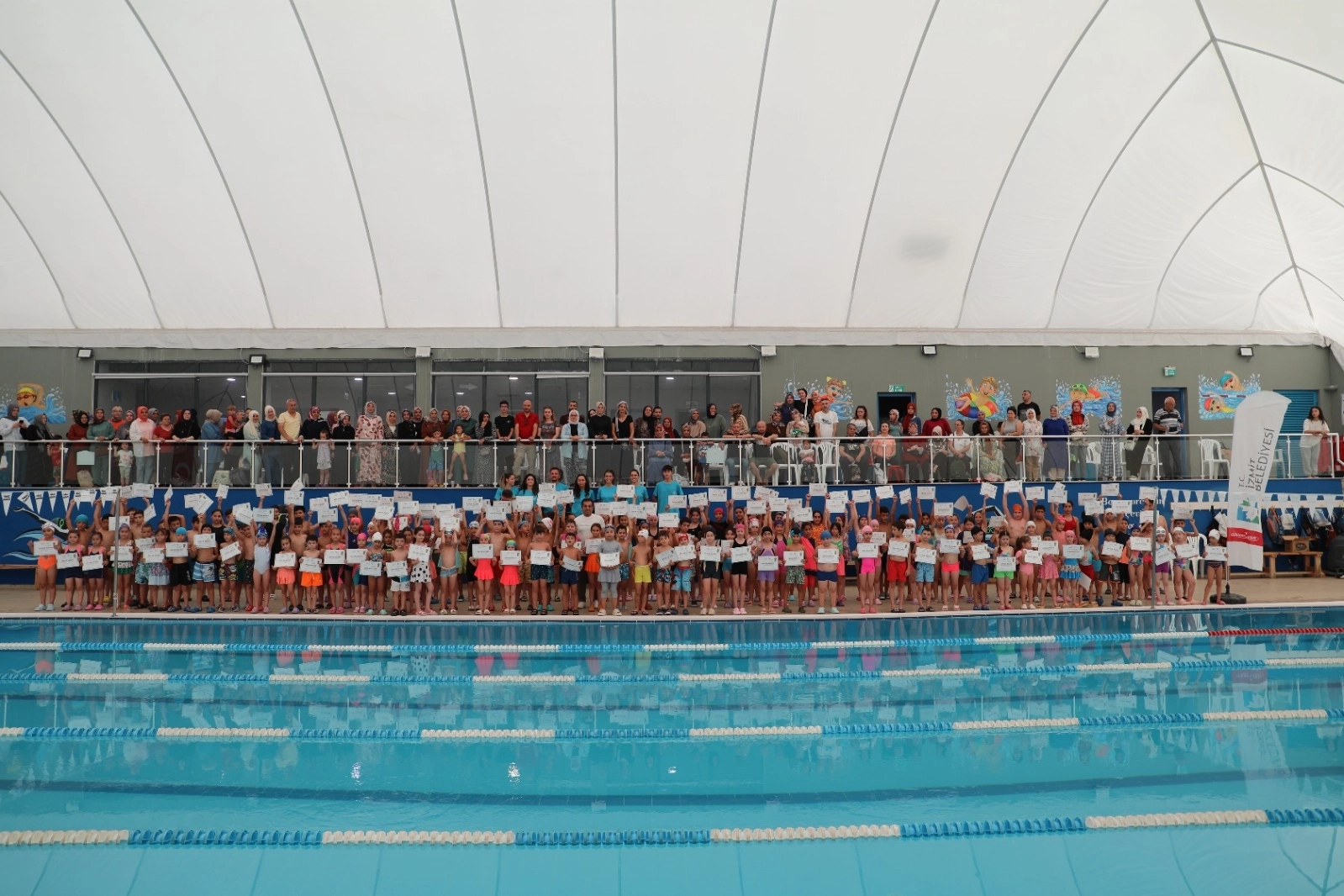 KOCAELİ (İGFA) - İzmit Belediyesinin Yüzme Bilmeyen Kalmasın Projesi büyük bir ilgi ile devam ediyor. Bugüne kadar 9 binin üzerinde öğrencinin faydalandığı projede Temmuz ayı eğitimlerini tamamlayan minik yüzücülere sertifikaları verildi. Tepeköy Mahallesindeki İzmit Belediyesi Kapalı Yüzme Havuzunda düzenlene sertifika töreninde İzmit Belediye Başkan Yardımcısı Lütfü Obuz ve Spor İşleri Müdürü Mithat Ağa yüzücülere sertifikalarını takdim etti.