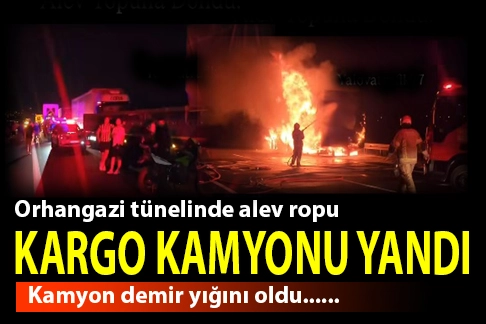 Şoför Ramazan Altıntop yönetimindeki bir kargo kamyonu, Orhangazi’de tünel çıkışında yandı. İstanbul-İzmir otobanı bir müddet trafiğe kapandı.Araçtaki yangını fark eden Altıntop aracını kenara çekti. Yangının çıkış nedeni belli olmöazken bölgeye gelen itfaiye kamyonu,2 saatte söndürdü.
