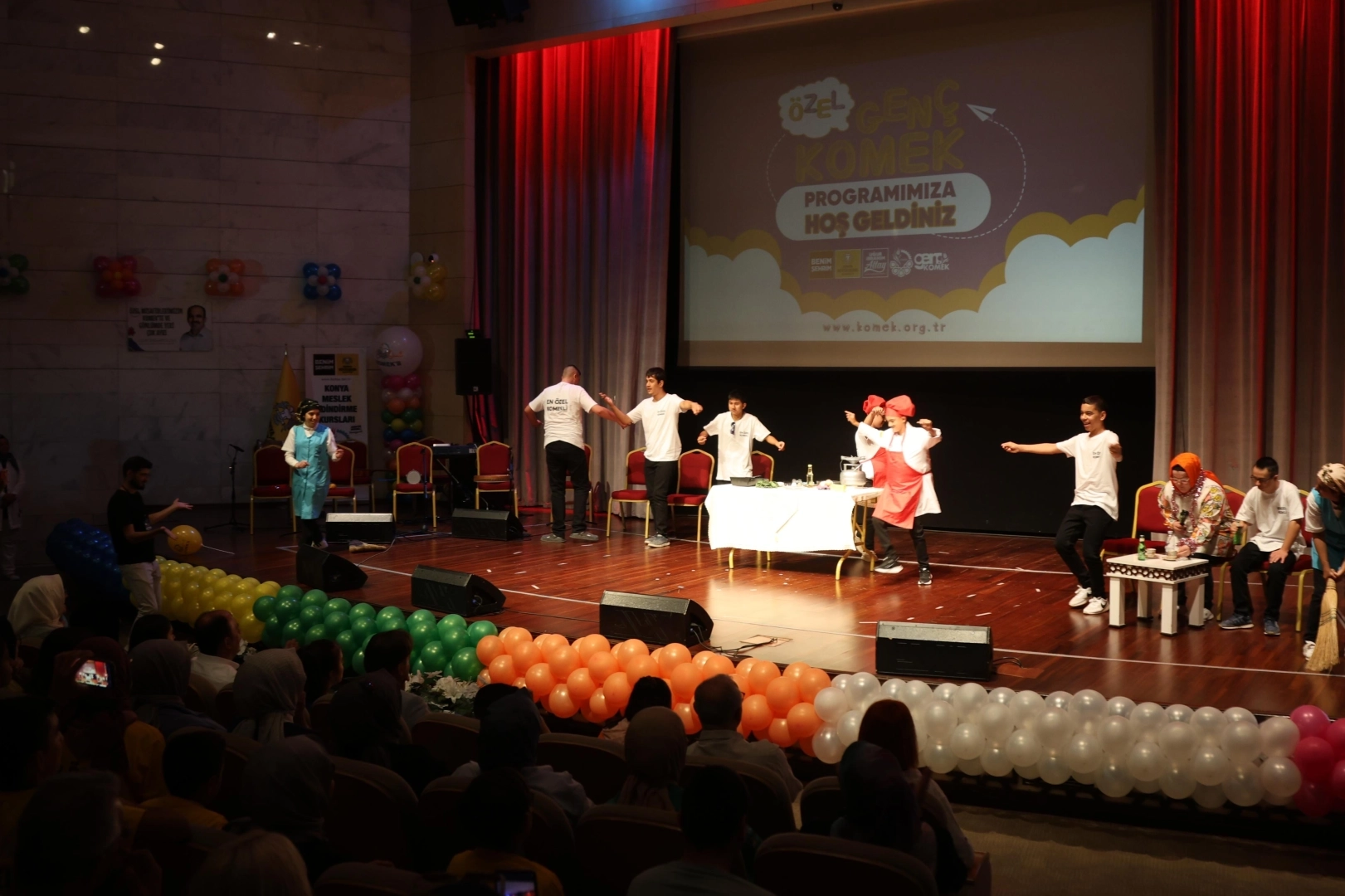 KONYA (İGFA) - Konya Büyükşehir Belediyesi Meslek Edindirme Kursları bünyesinde “En Özel KOMEK'li” temasıyla hizmet veren Özel Genç KOMEK Yaz Okulu coşkulu bir kapanış programıyla tamamlandı. Konya Büyükşehir Belediye Başkanı Uğur İbrahim Altay, Büyükşehir Belediyesi Mevlana Kültür Merkezi’nde gerçekleştirilen programda özel çocukların ve ailelerinin coşkusuna ortak oldu. Başkan Altay program öncesi özel öğrencilerin katkılarıyla üretilen el emeği ürünlerin yer aldığı standın açılışını gerçekleştirdi.