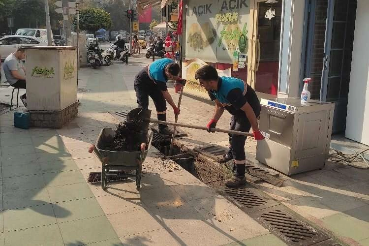 Ekipler İzmir Caddesi üzerinde bulunan yağmursuyu ızgaralarının iç kısımlarındaki katı atıklar ve çöpleri temizleyerek taşkınlara karşı önlem aldı.
