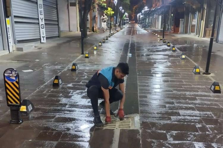 Yağmur suyu ızgaralarına yağış ile birlikte dolan malzemeler temizlenirken, ana kanalizasyon hatları da yapılan hızlı müdahaleler ile açıldı.