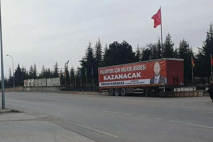 Bağımsız aday Erkan Karakaş bu seferde bir TIR’ı seçim aracı yapıp Pazaryeri ilçesinde yine gündem oldu.