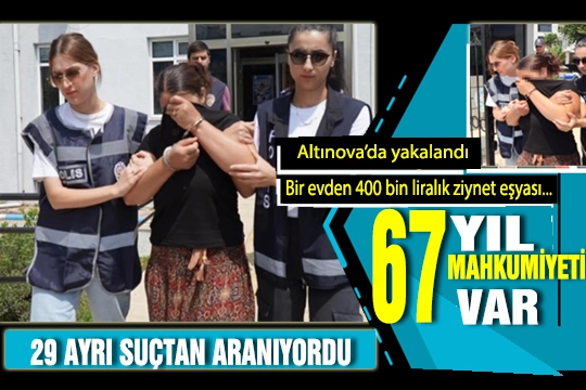 Yalova Cumhuriyet Başsavcılığı koordinesinde Altınova İlçe Emniyet Müdürlüğü ekipleri, hakkında kesinleşmiş 67 yıl hapis cezası bulunan Y.U’ nun bir evden 400 bin lira değerinde ziynet eşyasının çalınması olayının failinin tespiti ve yakalanmasına yönelik çalışmalar yürüttü. Yalova'ya hırsızlık için geldiğini tespit edilen Y.U polisin bir operasyonu ile kıskıvrak yakalanarak hakim karşısına çıkarıldıktan sonra tutuklandı..