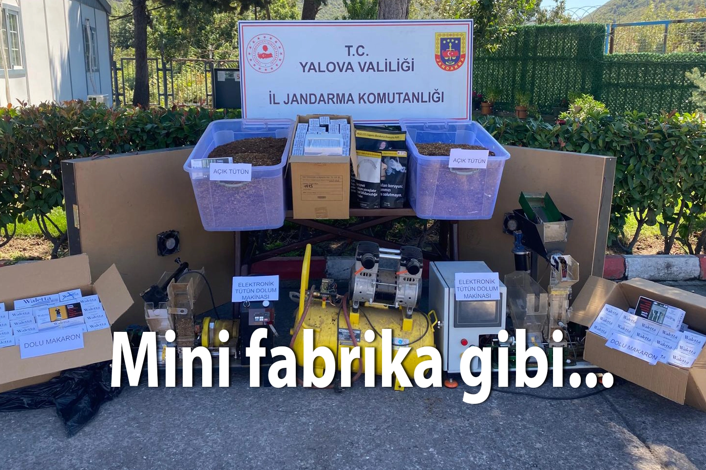 Yalova İl Jandarma Komutanlığınca Kaçakçılık ve Organize Suçlar Şube Müdürlüğü ile Çiftlikköy İlçe Jandarma Komutanlığı, 21 Ağustos 2025 tarihinde Çiftlikköy’de M.A. ve İ.A. adlı şahıslara ait adres ve araçlarda yapılan aramalar sonucunda;1.150 Kg bandrolsüz kaçak tütün,84.200 Adet boş makaron,21.424 Adet dolu makaron,2.000 Adet boş sigara paketi,109 Paket kaçak sigara,2 Adet elektronik tütün doldurma makinası,1 Adet kompresör,2 Adet fanlı tütün kurutma düzeneği,1 Adet nemölçer,1 Adet terazi ele geçirdi. Yakalanarak gözaltına alınan ve yasal işlemlerin ardından adli makamlara sevk edilen şüpheli M.A. tutuklandı. İ.A. adlı şüpheli hakkında adli kontrol kararı ile tutuksuz yargılanmak üzere serbest bırakıldı.