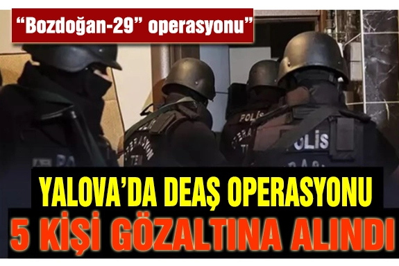 İçişleri Bakanı Ali Yerlikaya’nın paylaştığı bilgilere göre 7 ilde DEAŞ terör örgütüne yönelik “Bozdoğan-29” operasyonları düzenlendi. Yalova da yapılan operasyonda 5 DEAŞ şüphelisi yakalandı.