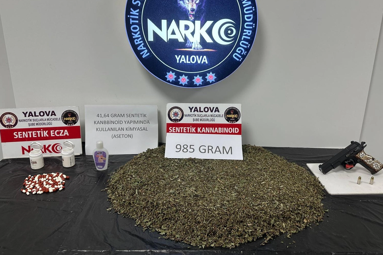 06.05.2025 tarihinde uyuşturucu madde ticareti yaptıkları belirlenen S.Ö ve T.Ö’nün ikametinde gerçekleştirilen aramada; 1 Adet Sarsılmaz Mega 2000 Kılınç Light marka model tabanca, 2 adet 9X19 çapında mermi, 78 adet sentetik ecza,41,64 gram uyuşturucu madde yapımında kullanılan Kimyasal Madde, 2 parça halinde daralı ağırlığı 985 gram Sentetik Kannabinoid maddesi ele geçirildi..