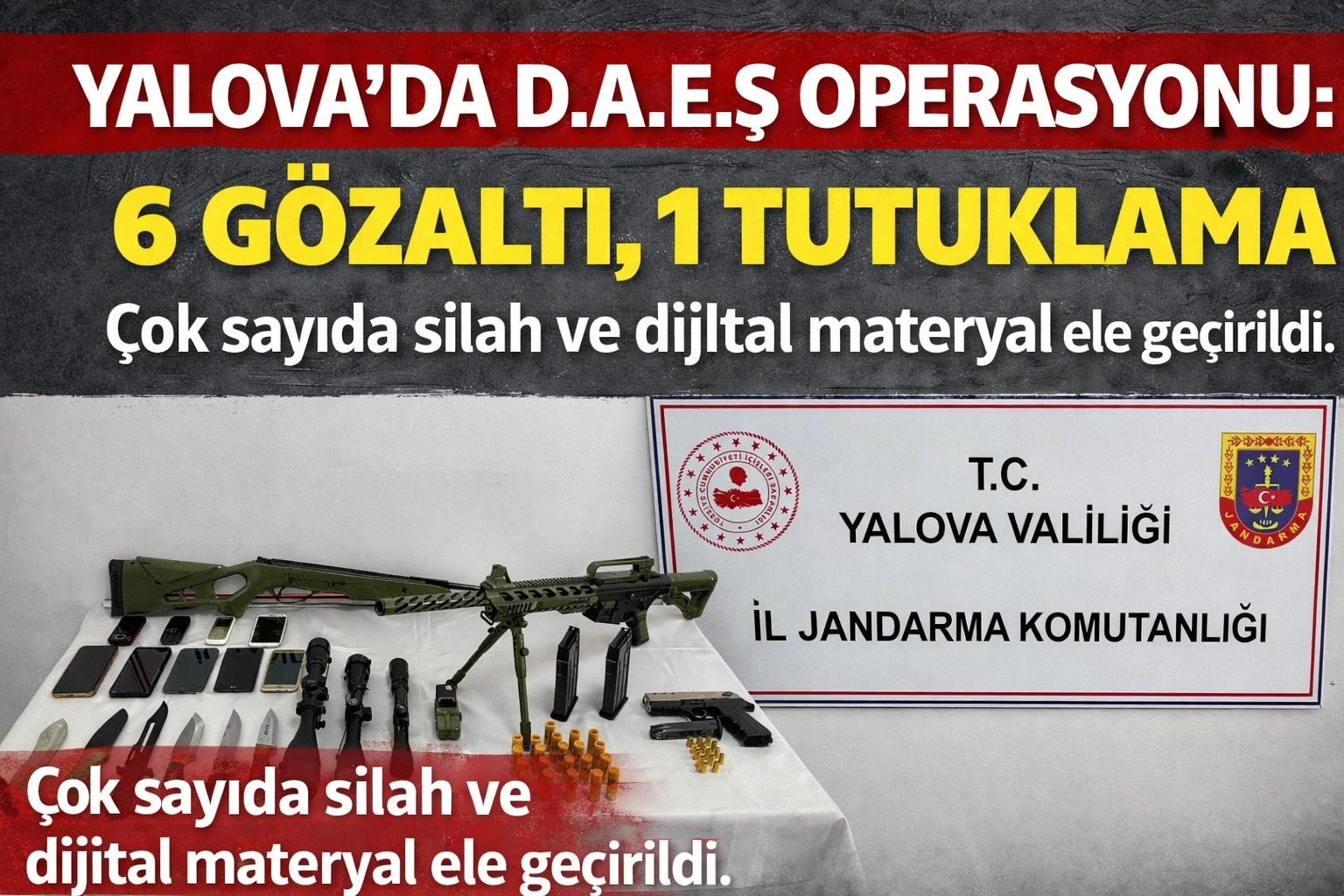 YALOVA — Yalova İl Jandarma Komutanlığı ekipleri, DEAŞ terör örgütüne yönelik yürüttüğü çalışmalar kapsamında Yalova’da eş zamanlı operasyon düzenledi. Operasyonda 6 şüpheli yakalanırken, çok sayıda silah ve dijital materyal ele geçirildi.
