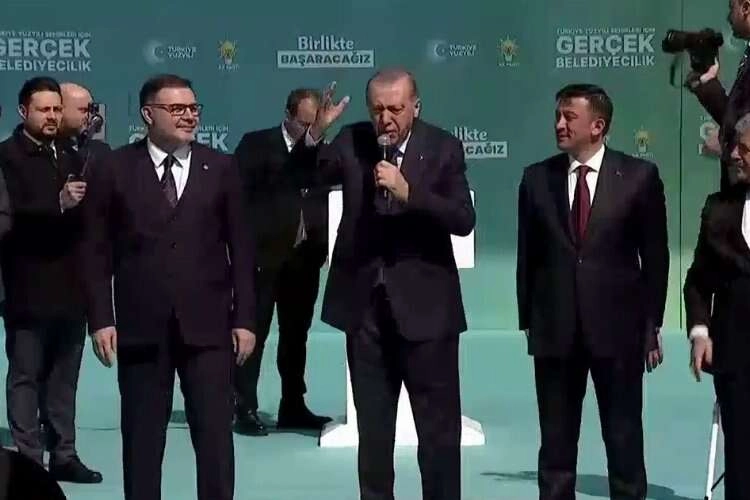 Cengiz Kurtoğlu'nun seslendirdiği "Duyanlara duymayanlara" şarkısıyla miting alanındaki platforma çıkan Cumhurbaşkanı Erdoğan'a, İzmir Büyükşehir Belediye Başkan adayı Hamza Dağ ile Cumhur İttifakı temsilcileri de eşlik etti.