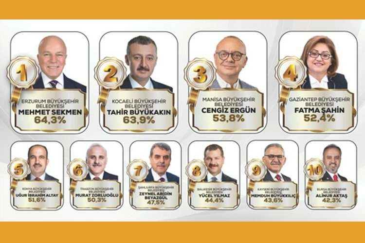 Gaziantep Büyükşehir Belediye Başkanı Fatma Şahin yüzde 52,4 dördüncü, Konya Büyükşehir Belediye Başkanı Uğur İbrahim Altay yüzde 51,6 ile beşinci, Trabzon Büyükşehir Belediye Başkanı Murat Zorluoğlu yüzde 50,3 ile altıncı, Şanlıurfa Büyükşehir Belediye Başkanı Zeynel Abidin Beyazgül yüzde 47,5 ile yedinci, Balıkesir Büyükşehir Belediye Başkanı Yücel Yılmaz yüzde 44,4 ile sekizinci, Kayseri Büyükşehir Belediye Başkanı Memduh Büyükkılıç yüzde 43,6 ile dokuzuncu, Bursa Büyükşehir Belediye Başkanı Alinur Aktaş yüzde 42,3 ile onuncu oldu.