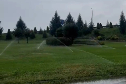 Daha bir hafta önce su sıkıntısı olduğunu ve tasarruflu su kullanılmasının gerektiğini açıklayan Düzce Belediyesi bugün gece boyun yağan yağış altında çim suladı.