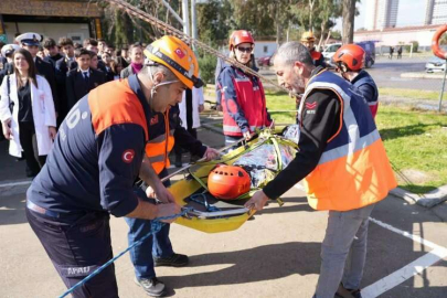 AFAD ve İzmir MEB AKUB ekibi liderliğinde gerçekleşen tatbikatta; deprem tahliyesi, yüksek kat kurtarma, binadan yaralı çıkarma, yangın tatbikatı ve arama kurtarma köpeği itaat gösterileri yapıldı.