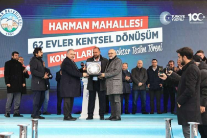 Konuşmaların ardından Başkan Yalçın ve Milletvekili Cıngı tarafından müteahhit Fikret Özdin’e plaket verilirken, sahneye çağırılan hak sahiplerine evlerinin anahtarları dualarla teslim edildi.